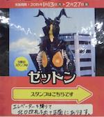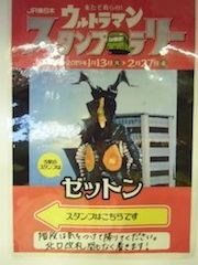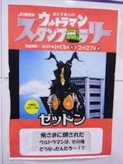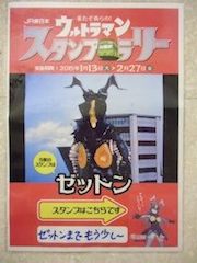 この他にも「目は無いが、角がレーダーだ」とか(柱の前に別のキャンペーンのぼりが置かれていたので写真が撮れず無念でした)、ウルトラマン本編を見た事のない小さなお友達にもアピールはばっちりです。 スタンプラリーの思い出と共に、最強怪獣・ゼットンのプロフィールも強く記憶される事でしょう。
