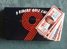 でもこれで来週以降も見られそうです。とりあえず御報告まで。 ところで先日、中野のまんだらけで1980年頃(推定)の「9 RIDERS QUIZ CARDS」なる「テレビランド」付録を入手しました。 小さい仕切りで4分割されていて、4.5cm×2.5cmの短冊形カードで総数180枚のライダークイズがみっしりと詰まっていました。(→写真御参照。ちなみに一番上のカードが1枚目で問題文は「1号に変身する人は!?」。裏に「本郷猛だ。かれは城南大学の学生で、優秀なオートバイレーサーだったんだ。」との回答) ちなみに1人のライダーに20問ずつ均等に質問が割り振られていた事も附記しておきます。(小さく快哉) |